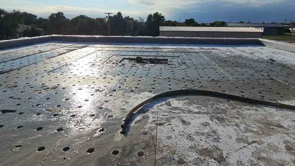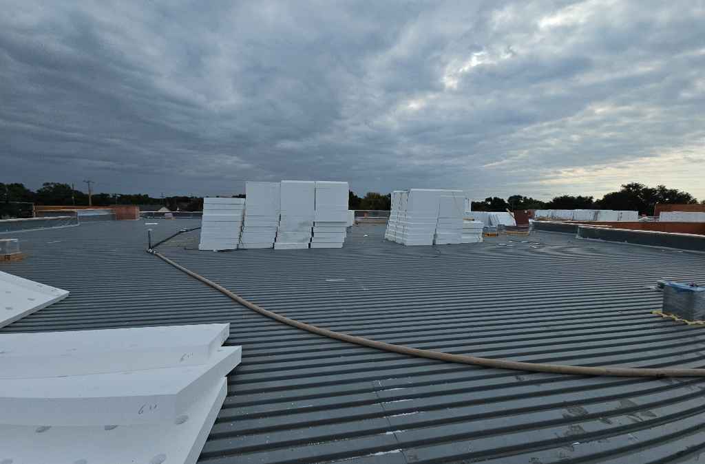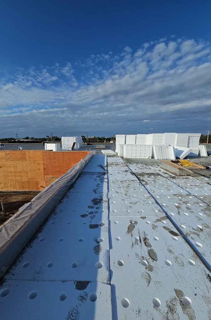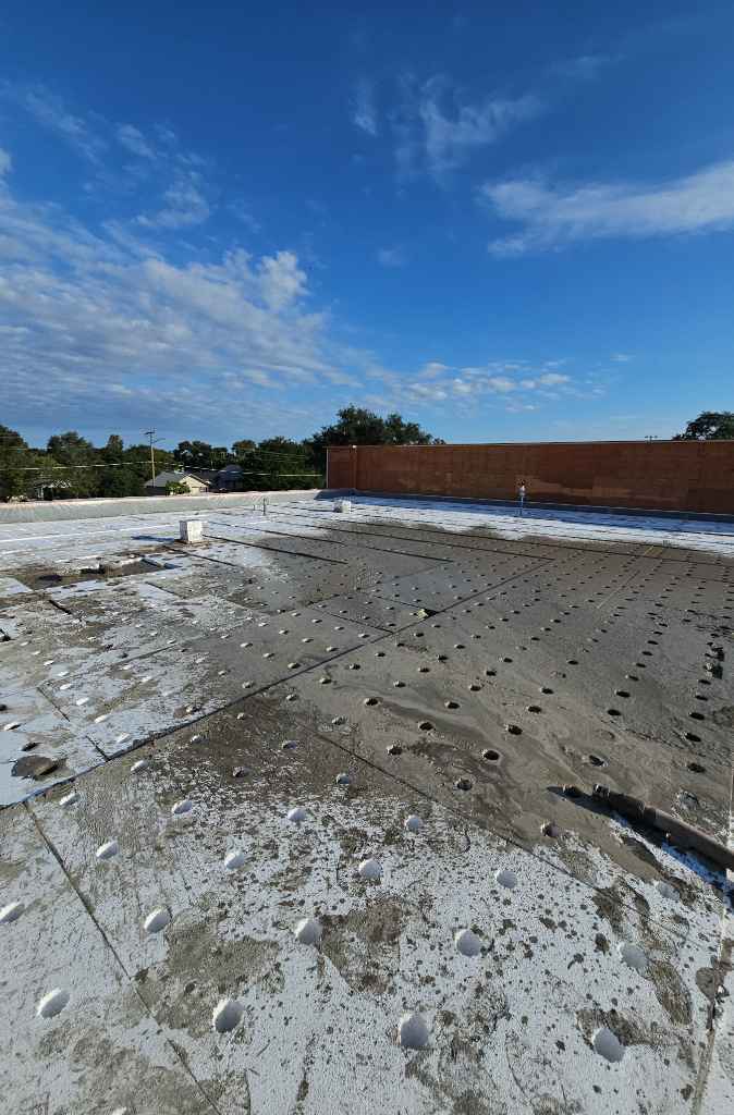 In this project, our objective was to achieve an average R-value of R-30 while implementing a positive drainage slope of 1/4 inch per foot. To accomplish this, expanded polystyrene (EPS) boards of varying sizes are used to create the necessary slope before applying a minimum of 2 inches of LWIC on the surface. This method not only ensures effective drainage but also provides a robust substrate for adhering the roofing membrane.