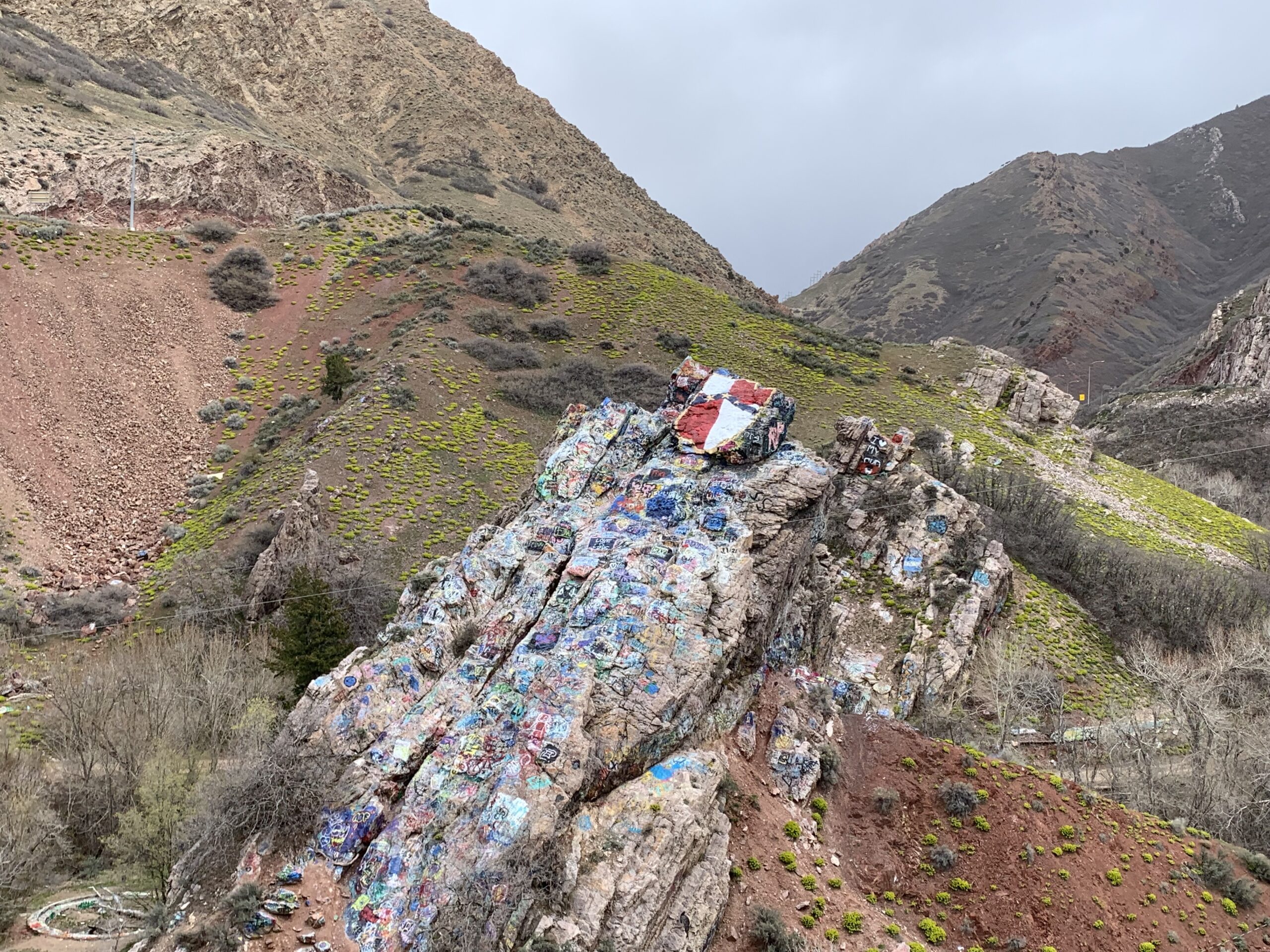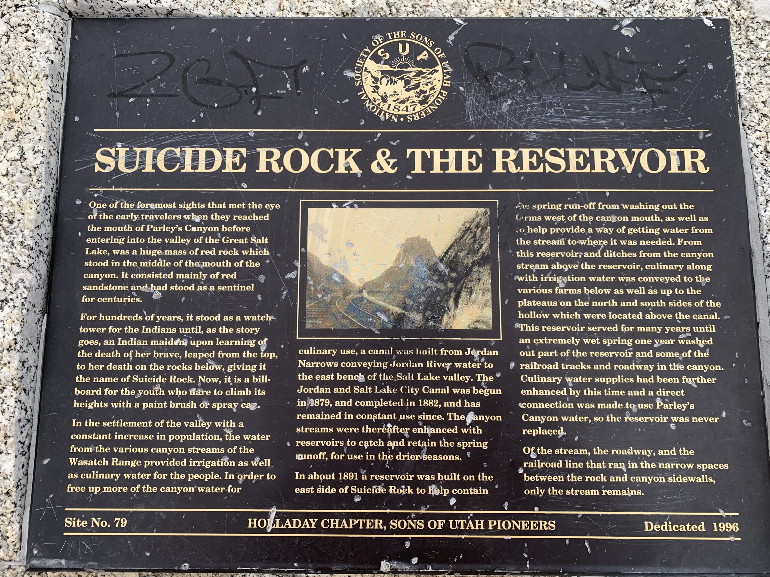 Just off the East side of I-215 near exit 1 stands an iconic rock formation known as Suicide Rock at the mouth of Parley’s Canyon. This highly vandalized rock is a billboard for youthful rebellion, love, loss, and causes they support. The name is adopted from a local Native American legend of a Native American maiden who threw herself from this lookout point because her betrothed Brave was killed in battle.