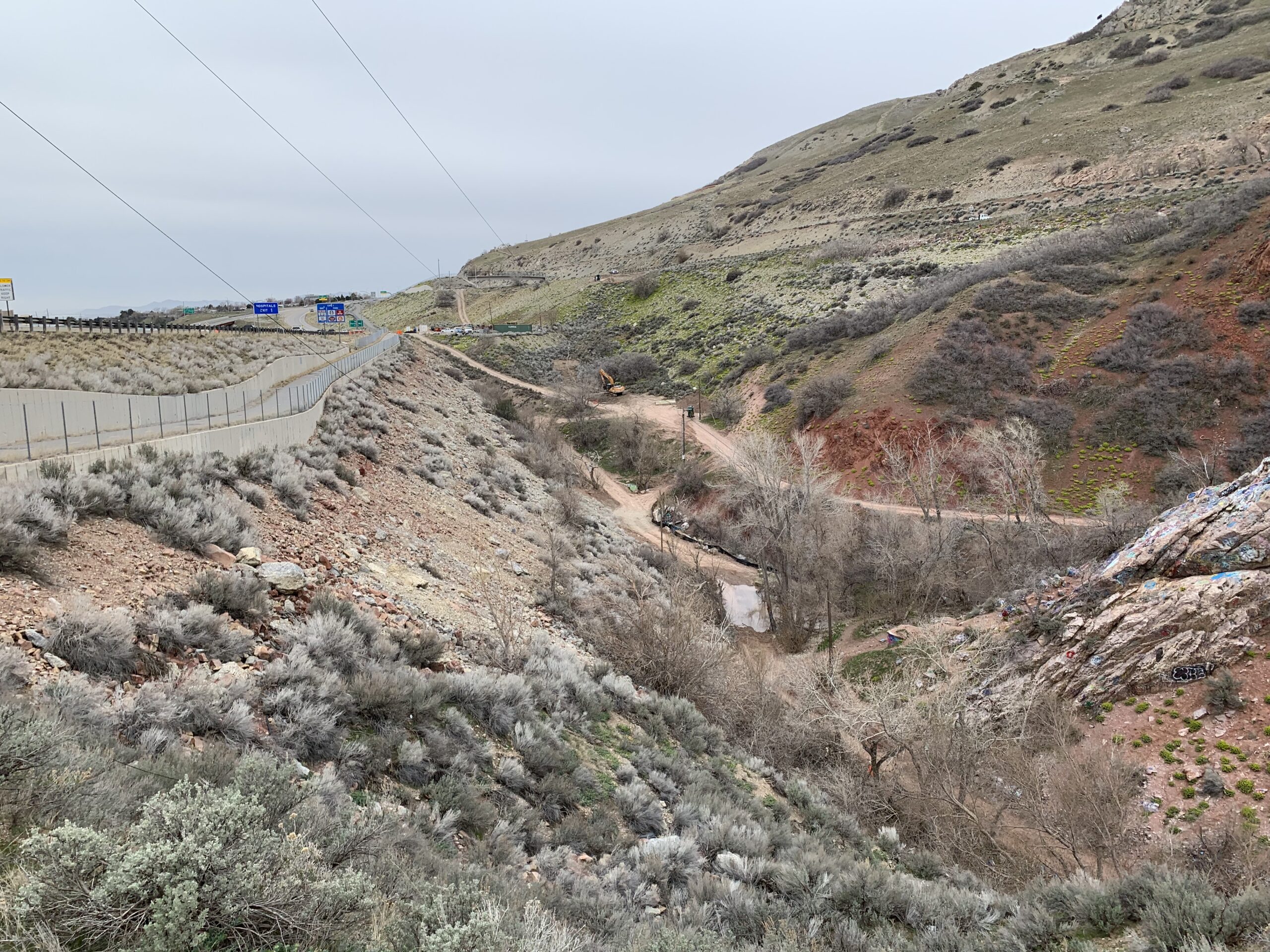 A steep winding dirt service road with sharp turns along the Parley’s Creek and rock formations is the main access to this site where a new waterline was placed inside the older pipeline. These conditions made it impossible to get large equipment down to the bottom or to get trucks bearing any load back up the road after working on the annular fill inside the pipeline.